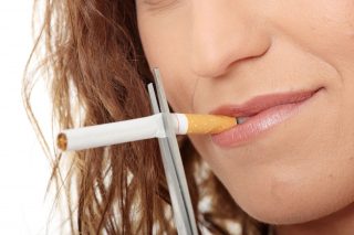 Young woman quiting smoking, isolated on white – focus on hand
