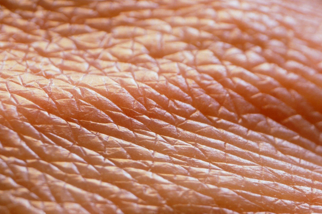 Macrophotograph of the skin on the back of the hand of a young male human showing details of patterns in the outer cornified (keratinised) epidermis. The skin surface shows erectile hairs, which with sweat glands & blood capillaries form part of the temperature- regulatory mechanism of the body. Hairs are produced by hair follicles, which are cylindrical downgrowths of the surface epithelium ensheathed by connective tissue. A bundle of smooth muscle, the arrector pili muscle, is attached to the connective tissue sheath of each follicle. When contracted, the hair stands on end & its point of insertion is pulled down causing the effect known as “goose-flesh”., Image: 102840487, License: Rights-managed, Restrictions: , Model Release: no, Credit line: Profimedia, Sciencephoto RM