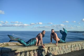 The funny pictures show the men, complete with shiny, scaly fishtails, posing on the rocks by the sea, in a pumpkin field and beside a waterfall (Photo: Profimedia)