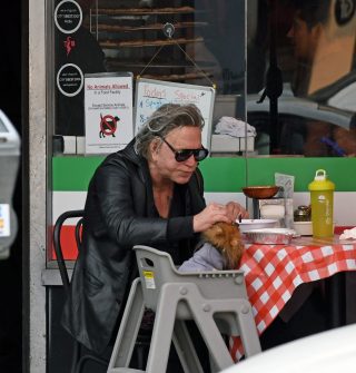 Mikey Rourke spoils his pet Pomeranian dog as he feeds him while haveing lunch al fresco in Beverly Hills (Photo: Profimedia)